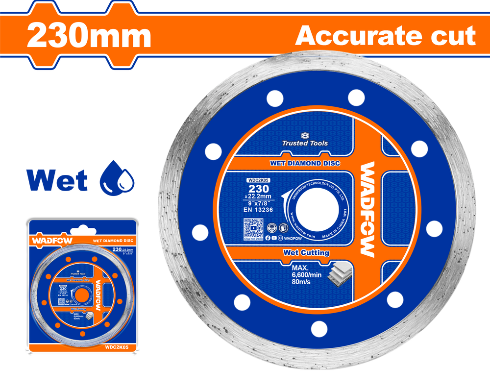 Disc diamantat continuu de la Wadfow, special conceput pentru taierea precisa a ceramicii. Cu un diametru de 230mm si prindere de 22.2mm, acest disc este ideal pentru lucrari de taiere umeda, oferind o suprafata neteda si fara ciobiri. Latimea lamei de 5mm asigura stabilitate si eficienta in procesul de taiere.