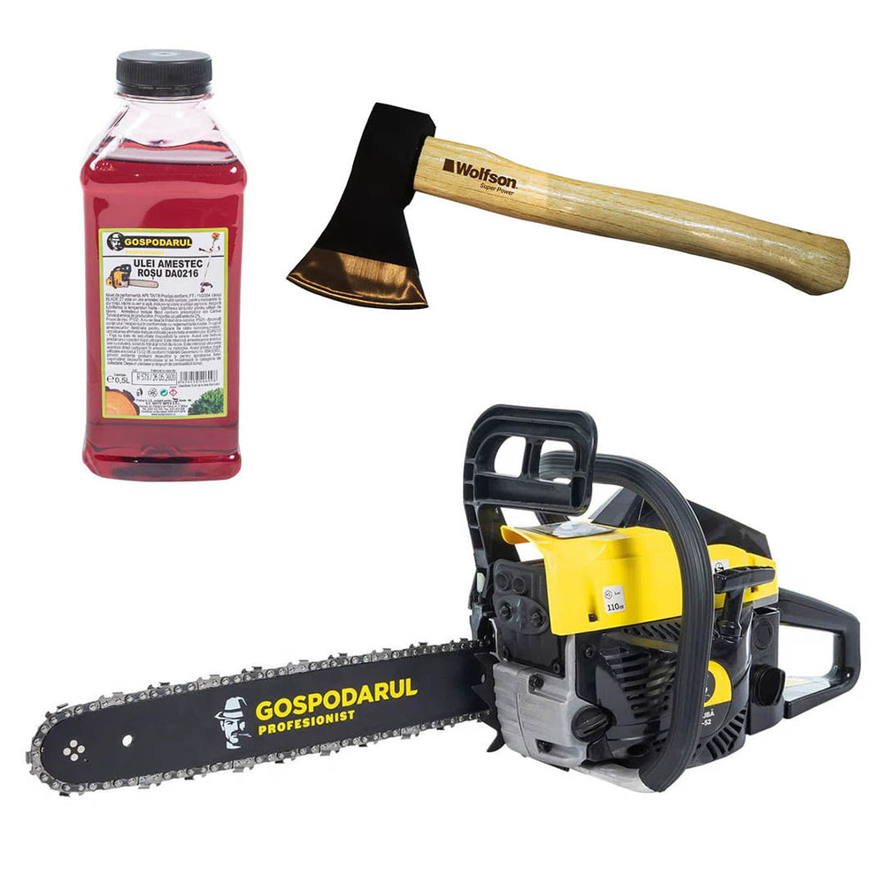 Drujba pe benzina Gospodarul Profesionist GP-5200 - 5 CP, 52cc + ulei amestec 0.5L si toporisca Wolfson 600g