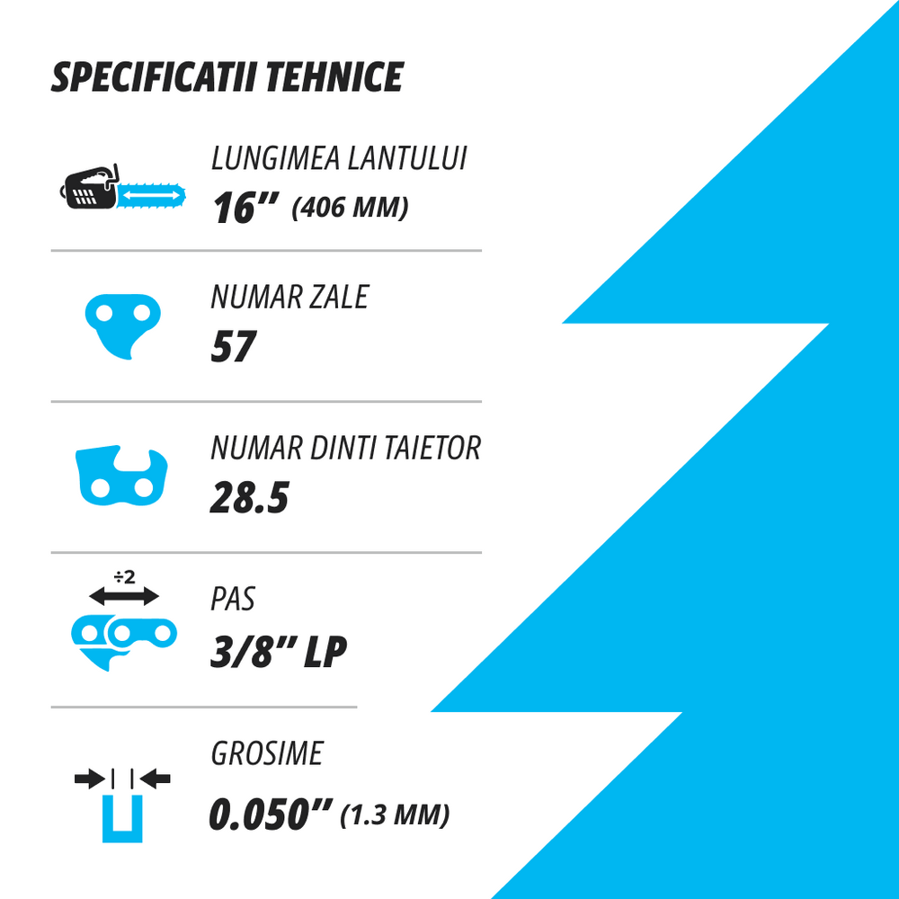 Lant pentru drujba KUZA, Lungime 16", pas 3/8" LP, grosime 050"-1.3 mm, 57 Zale, 1 lant/pachet.