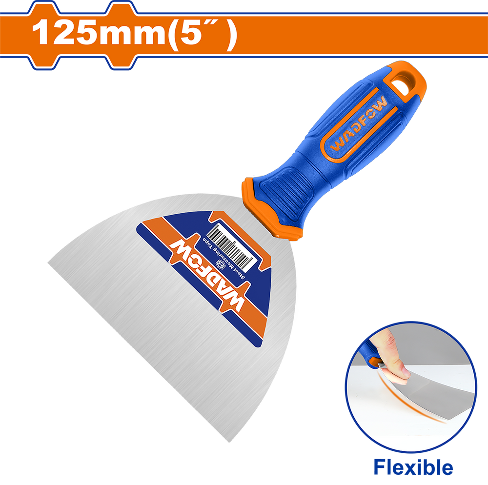 Spaclu metalic cu lama lata de 125 mm, tratata termic si cu finisaj lustruit pentru durabilitate si rezistenta la uzura. Manerul din plastic dublu colorat asigura confort si o prindere stabila in timpul lucrului, fiind potrivit pentru aplicatii de finisare si intindere a materialelor.